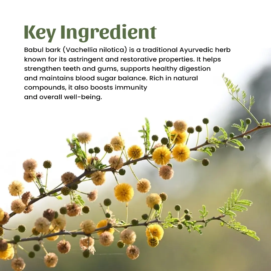 Este tipo de Churna también se conoce como “árbol curativo” porque todas las partes del Babul, como la corteza, la raíz, la goma, las hojas, las vainas y las semillas, se utilizan para diversos fines medicinales. Debido a las propiedades astringentes presentes en este polvo, fortalece las encías y los dientes.