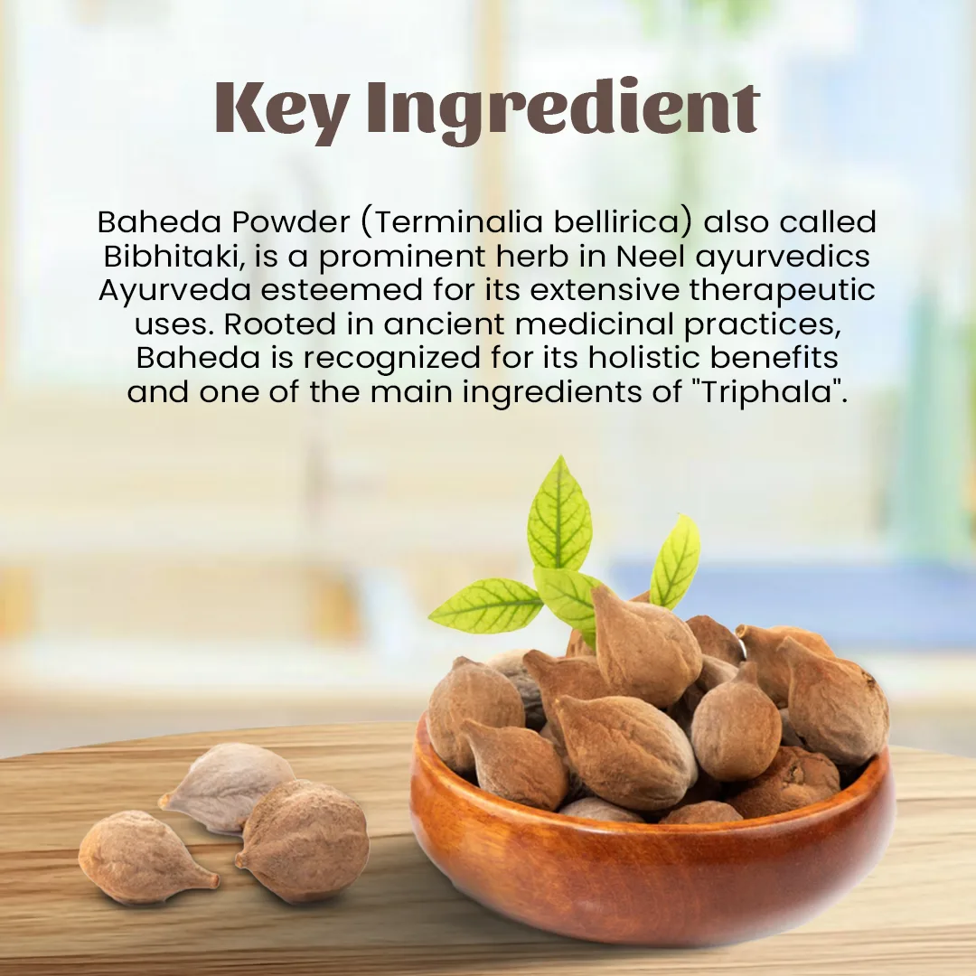 El polvo de baheda, también llamado bibhitaki, es una hierba destacada en la medicina ayurvédica Neel, apreciada por sus amplios usos terapéuticos. Con raíces en prácticas medicinales antiguas, la baheda es reconocida por sus beneficios holísticos y es uno de los principales ingredientes de la “triphala”.